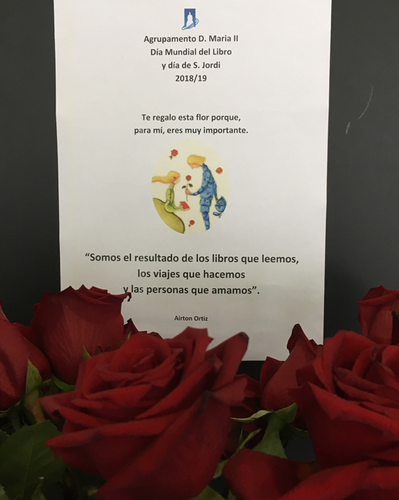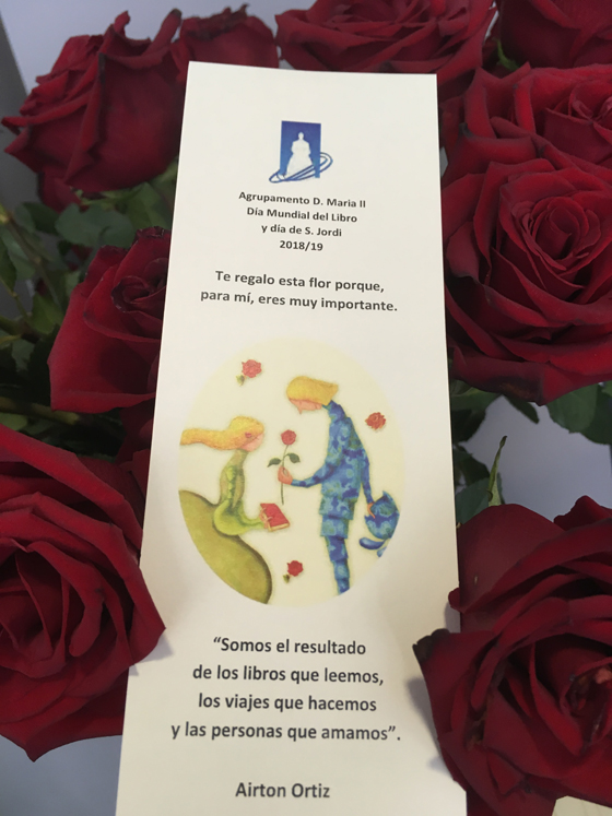 Cumprindo a tradição, os alunos distribuíram pela comunidade escolar rosas vermelhas naturais, acompanhadas por um marcador de livro com a mensagem “Te regalo esta flor porque, para mí, eres muy importante”, onde também se pode ler a romântica lenda de S. Jordi a evidenciar o triunfo da  coragem e do amor.