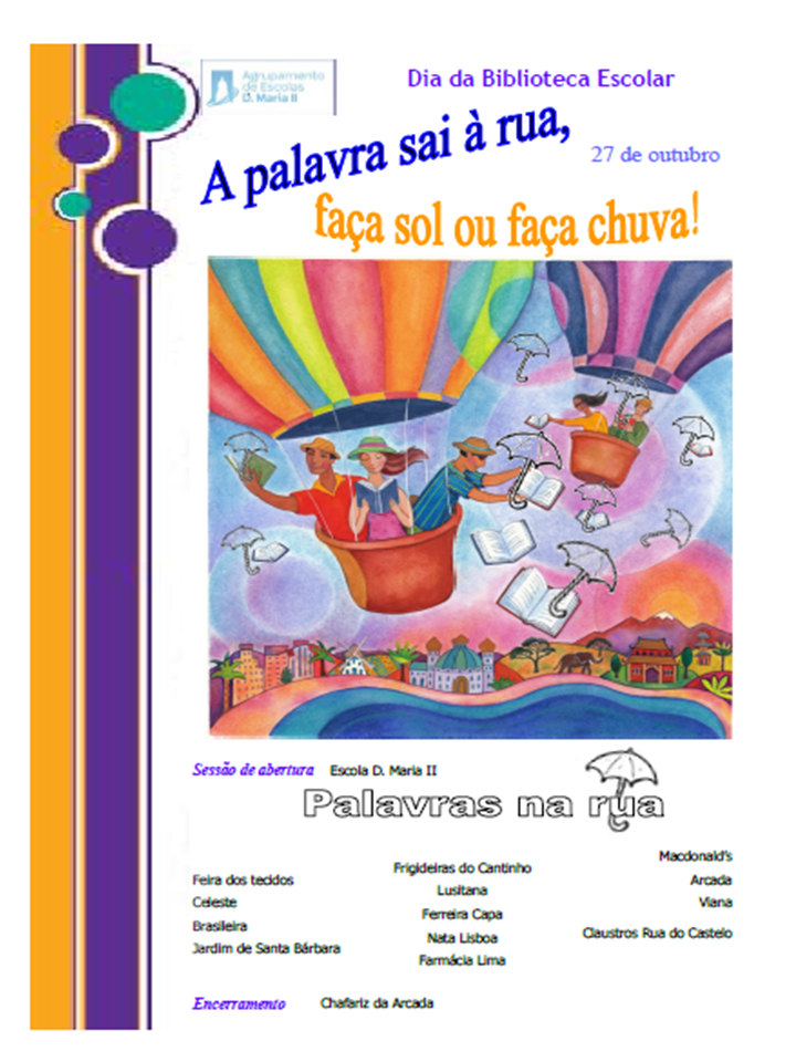 Conscientes de que o sucesso escolar dos nossos alunos depende da boa aquisição de práticas de leitura e de uma relação positiva com os livros, o nosso agrupamento dinamiza, no dia 27 de outubro, Dia da Biblioteca Escolar, a atividade “A leitura sai à rua, faça sol ou faça chuva”.
