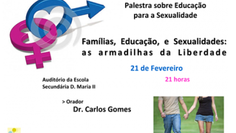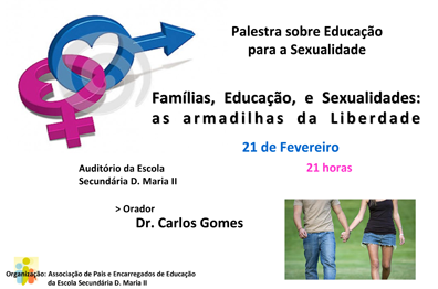 A APED - Associação de Pais e Encarregados de Educação da Escola Secundária D. Maria II convida Pais, Encarregados de Educação e toda a Comunidade Educativa a assistir à palestra - "Famílias, Educação, e Sexualidades: as armadilhas da Liberdade" que se realiza no dia 21 de fevereiro de 2014 (sexta-feira), pelas 21horas, no Auditório da Escola Secudária D. Maria II, tendo como orador o Doutor Carlos Gomes, professor da Universidade do Minho.